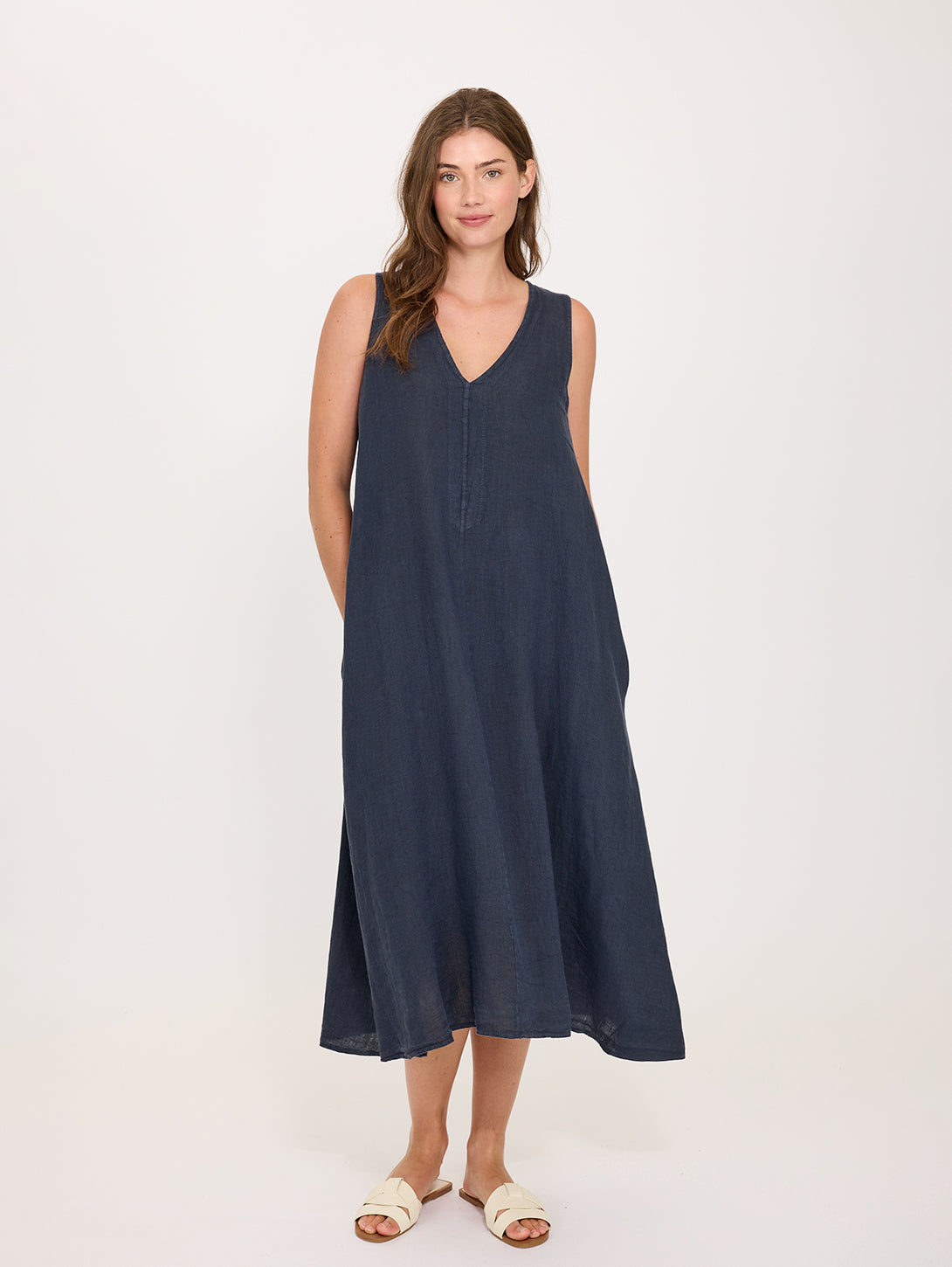 Midi Linen V Sleeveless Dresses - Midnight Navy