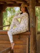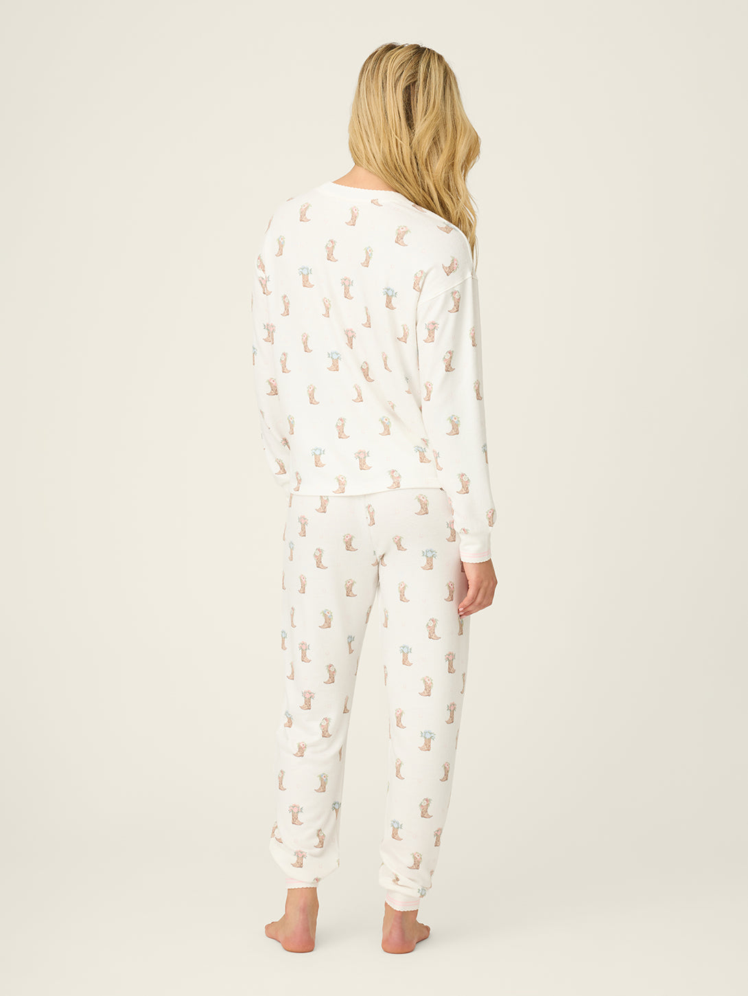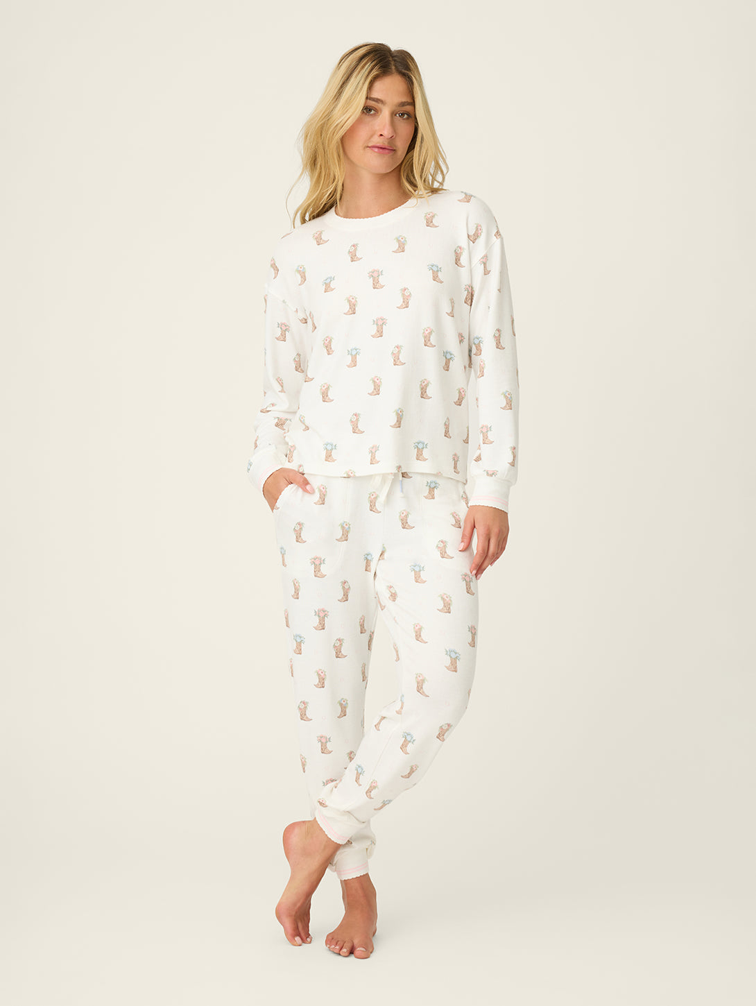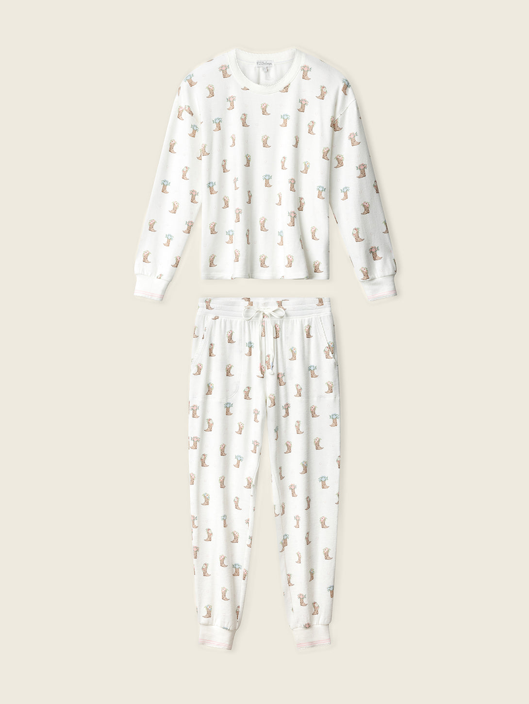 Saddle up for sweet dreams in this pajama lounge set, crafted in peachy-soft jersey and sprinkled with illustrated cowboy boots topped with delicate floral details. The relaxed long-sleeve top pairs perfectly with matching drawstring pants, finished with a comfy elastic waistband and scalloped trim for a soft, feminine touch. Made for slow mornings, lazy lounging, and kicking your boots off early.
