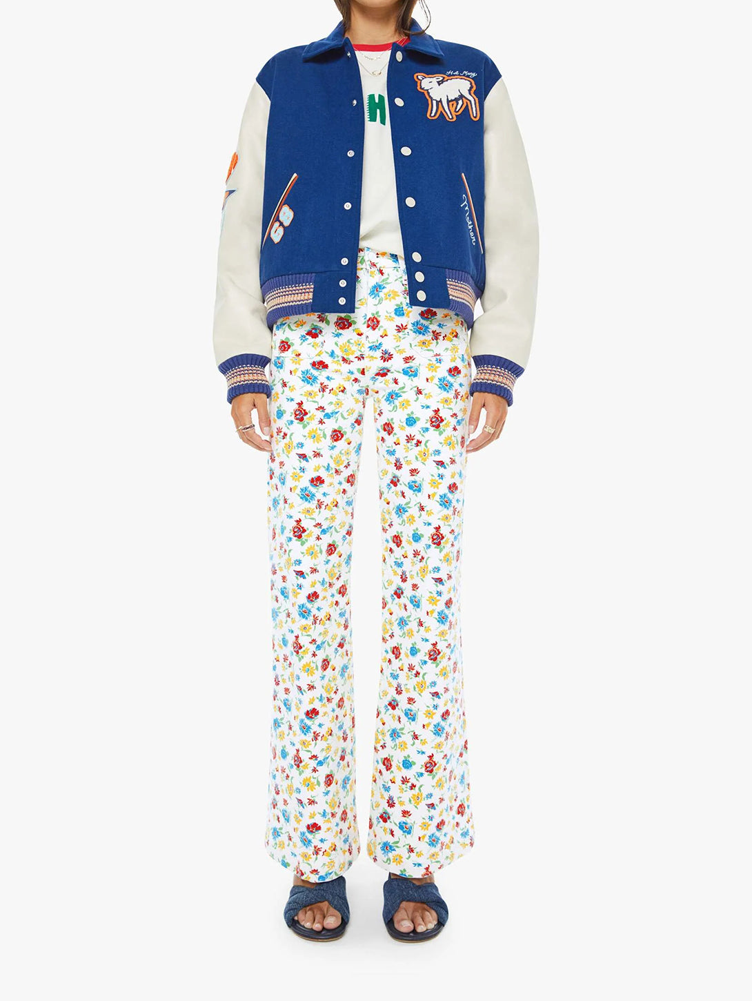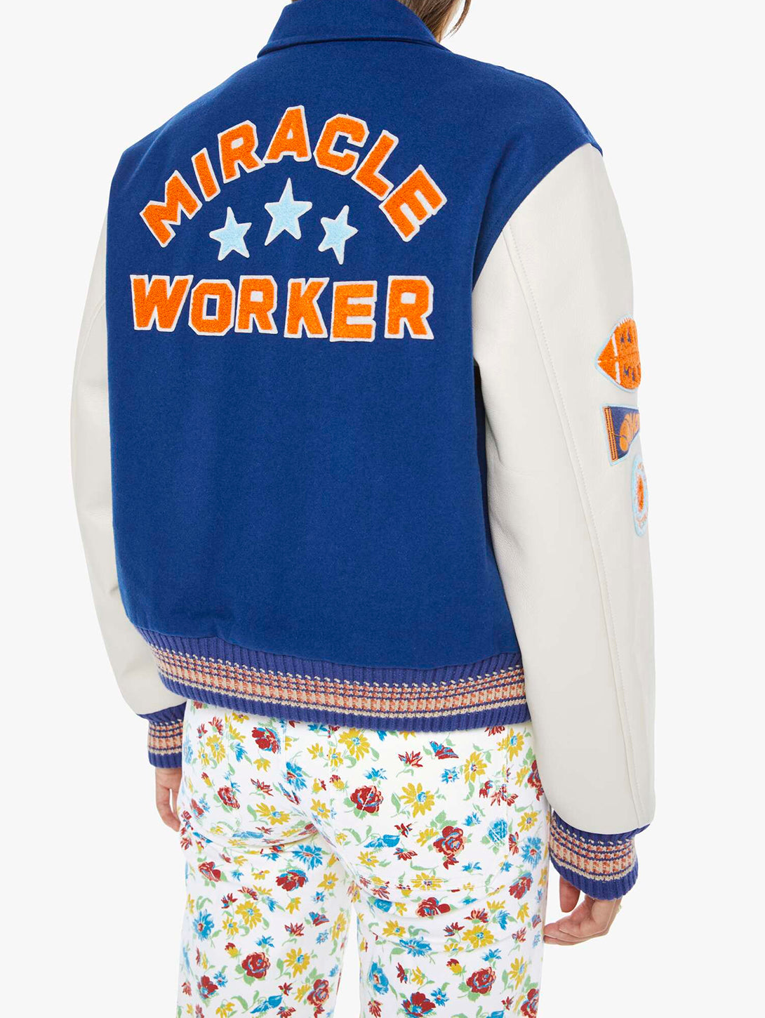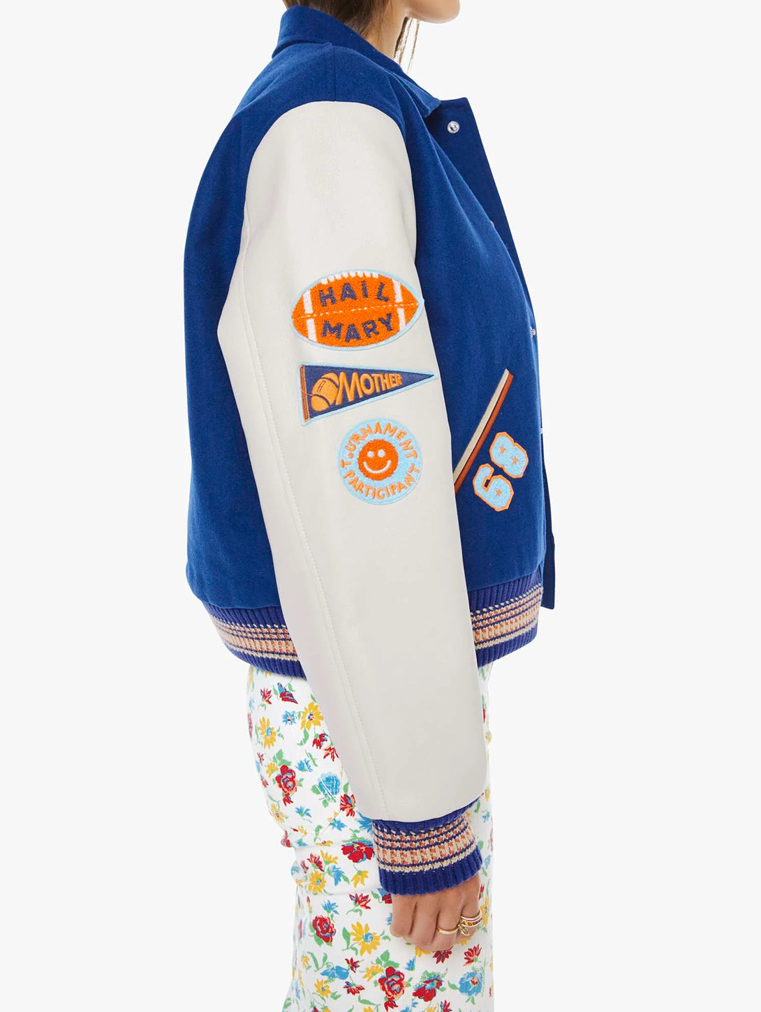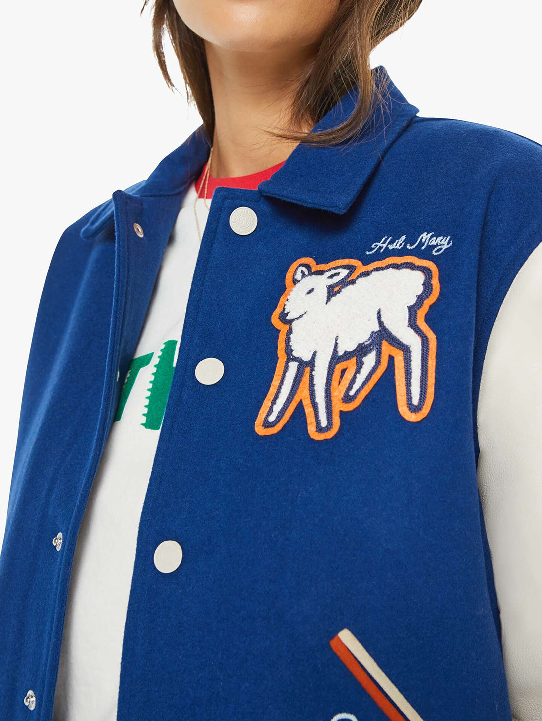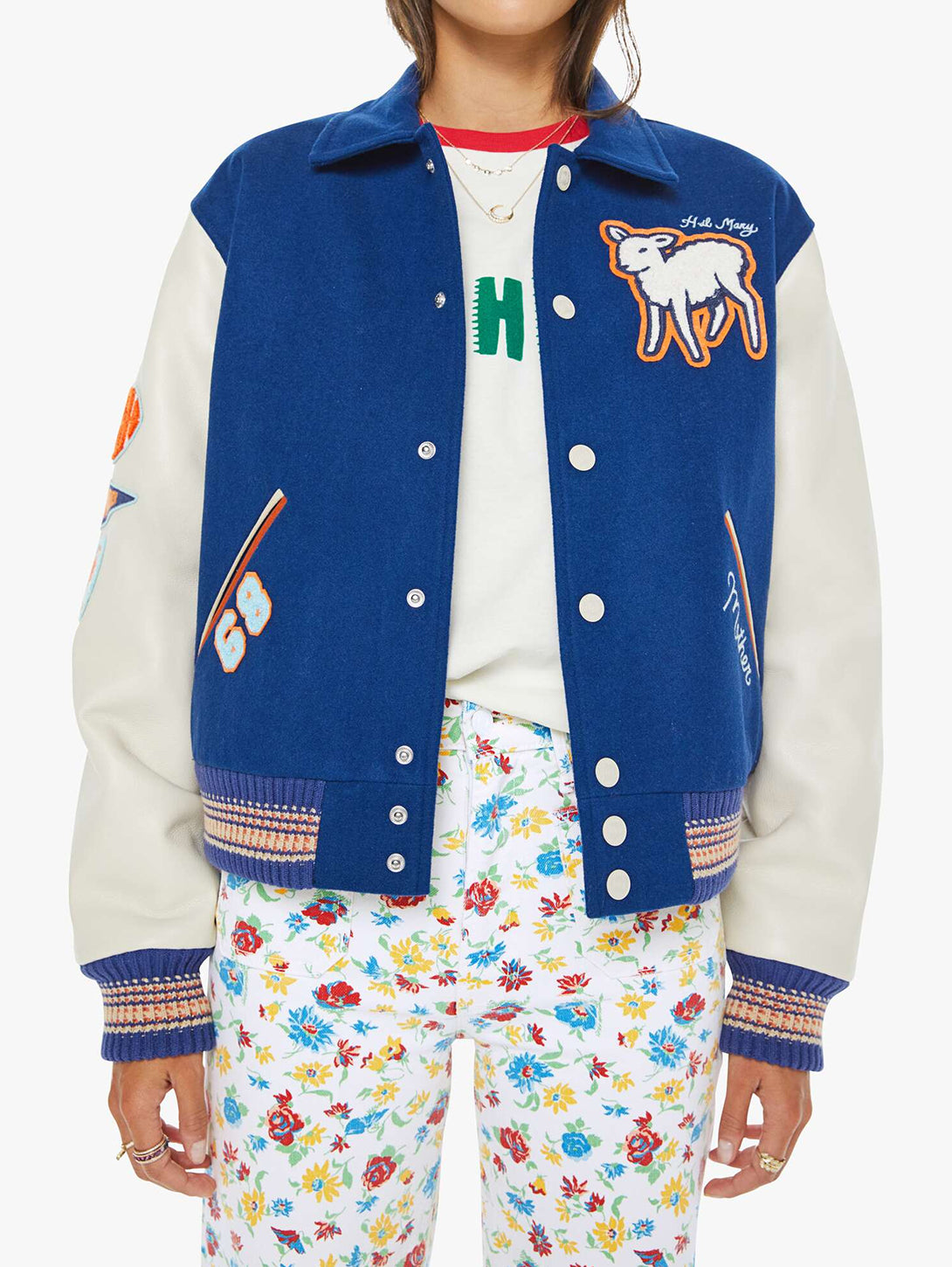 Out of bounds. MOTHER's take on the varsity jacket is designed with a collar, side slit pockets, buttons down the front and ribbed hems. Made from a wool blend, Away Game is a navy with off-white sleeves, red striped details and vintage-inspired chenille patches, pins and needlepoint throughout.