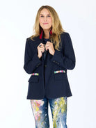 The Workday Love Brigade Blazer, in classic mens navy subtle pinstripe with Kerri's art details, making this one a show stopper. Love Brigade heart tapping on pockets and felting in unexpected colors under the collar, wear with you favorite jeans and your look is complete.