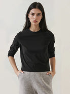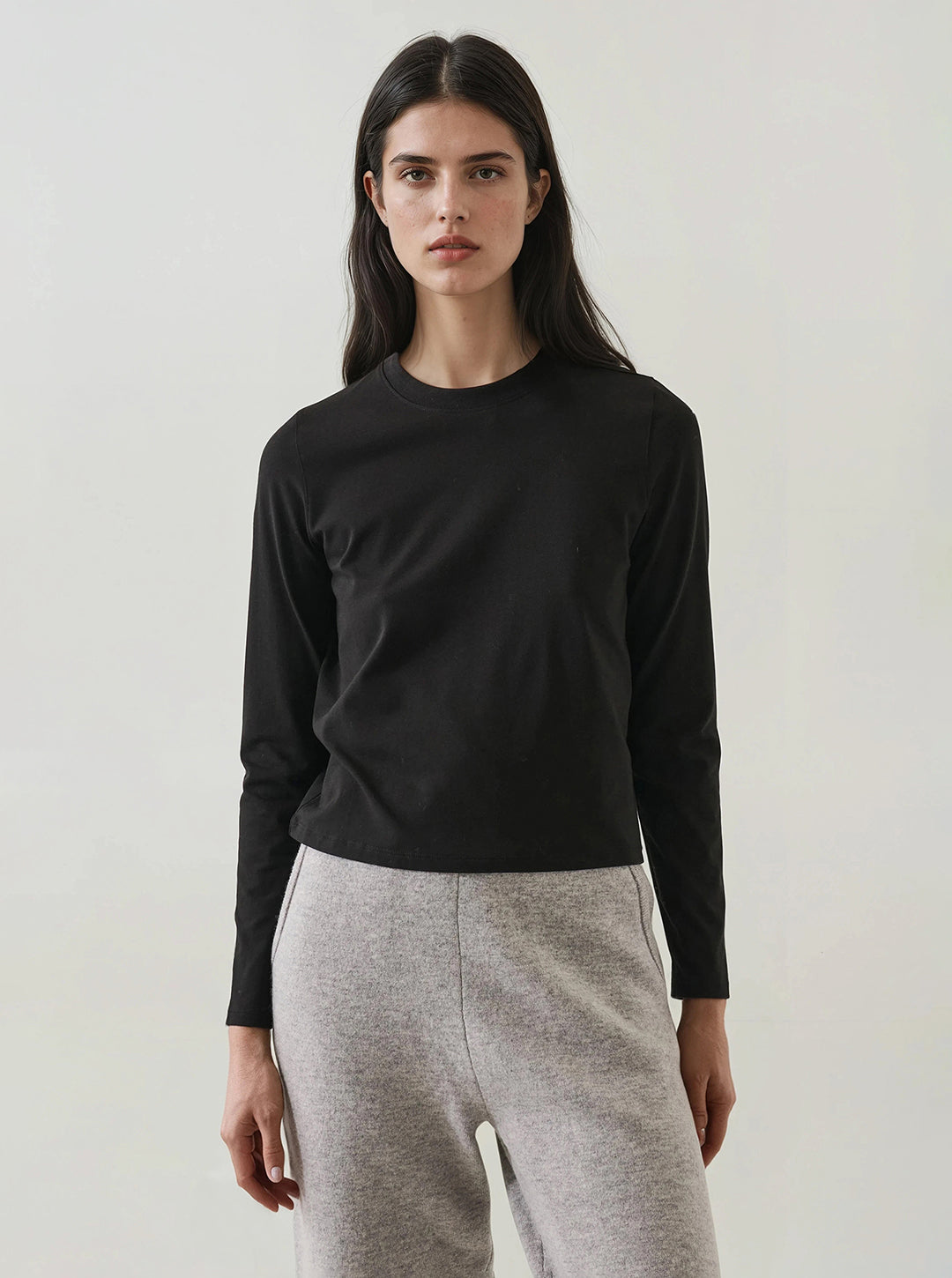 Our long sleeve baby t-shirt is cut from our iconic Peruvian pima cotton stretch jersey and cut in a slightly cropped fit. This piece is designed to be a season less wardrobe essential and is ideal to layer with your favourite denim or trousers.