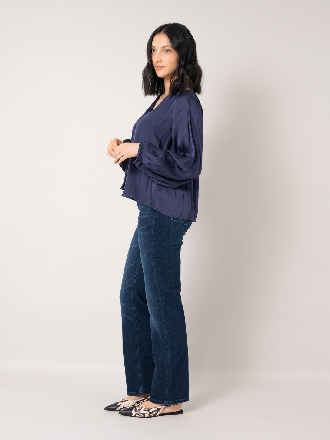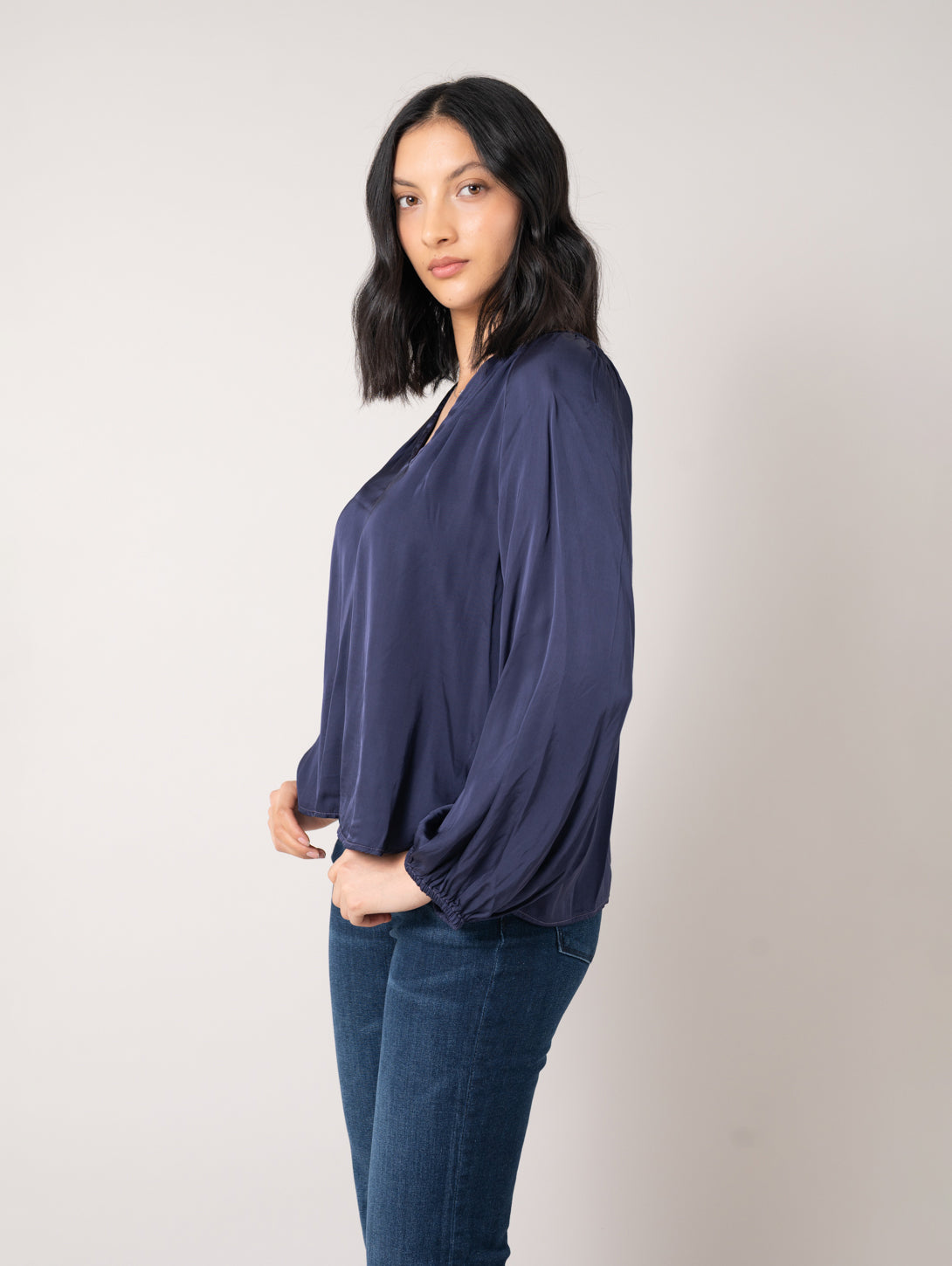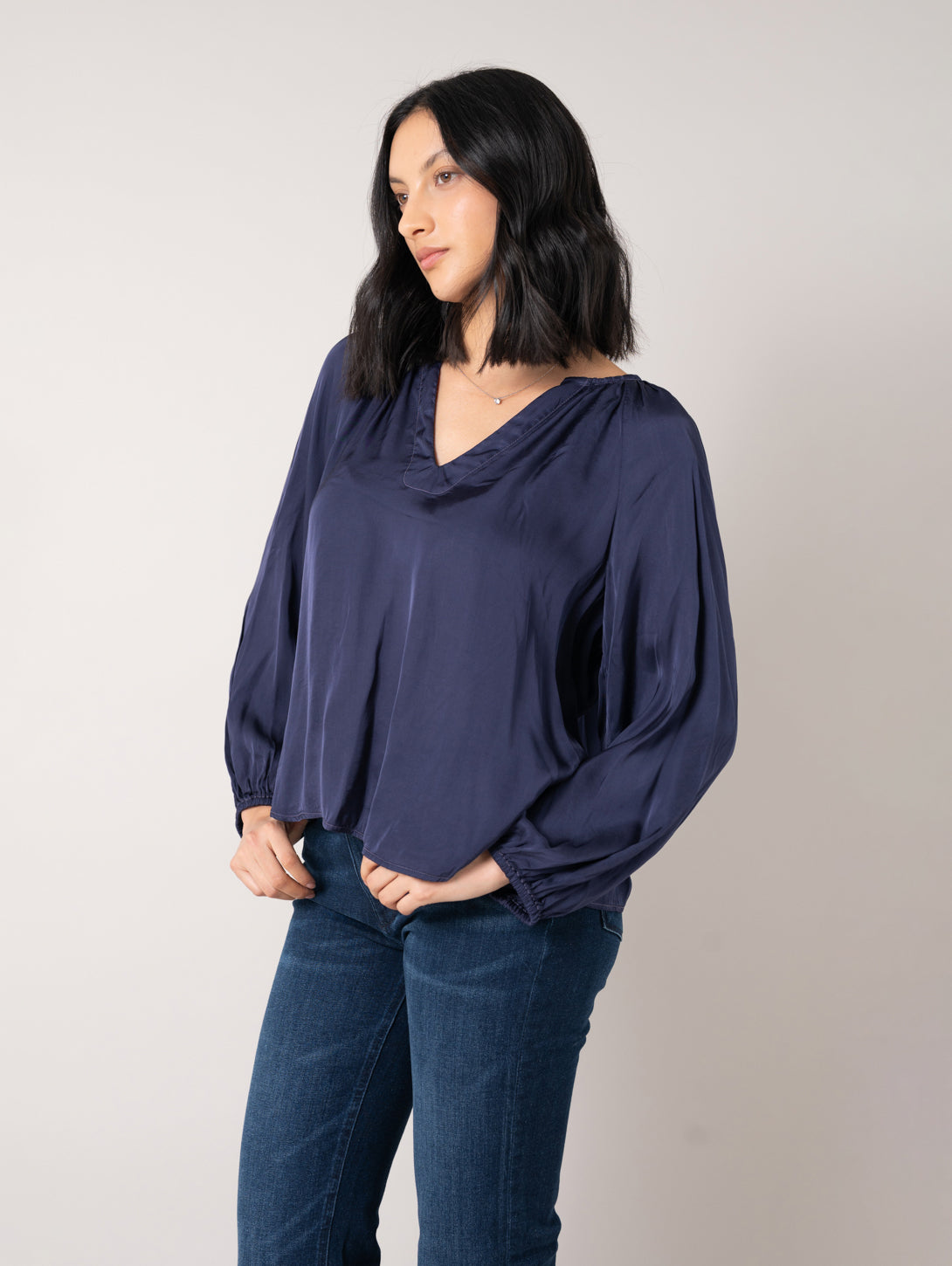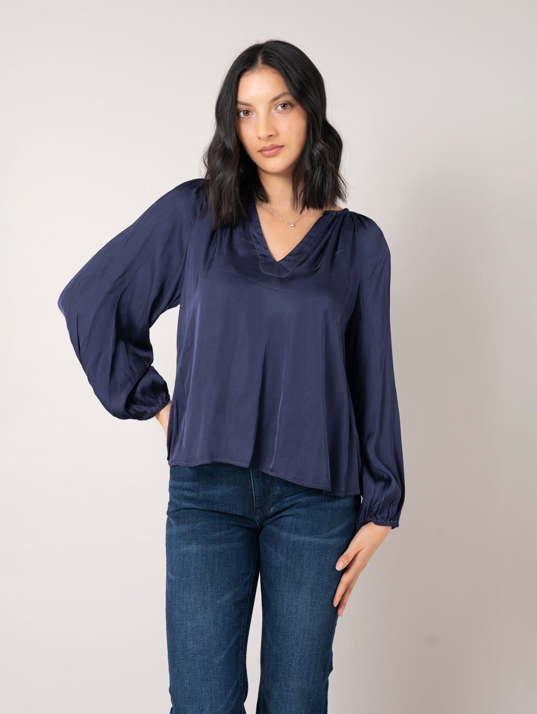 Elegant and lightweight, this satin top features a flattering V-neckline with subtle pleated detailing at the chest and back for added dimension. Offering a refined drape and soft sheen, this stunning piece is an easy choice for both dressy and casual looks. Pairs beautifully with the Larkin Pant.