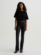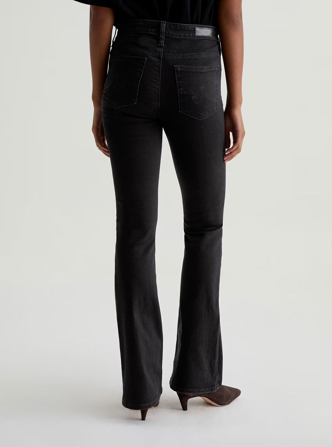 The Farrah Boot is a mid-rise bootcut jean featuring a deep, dark shade of black. Cut from 9 oz. True Vant Denim with figure-flattering stretch, the pair sits right at the natural waist and has a skinny fit through the legs before opening into a subtle flare at the hems.