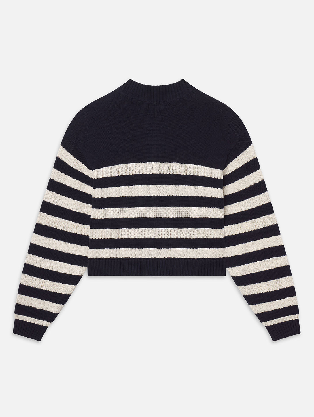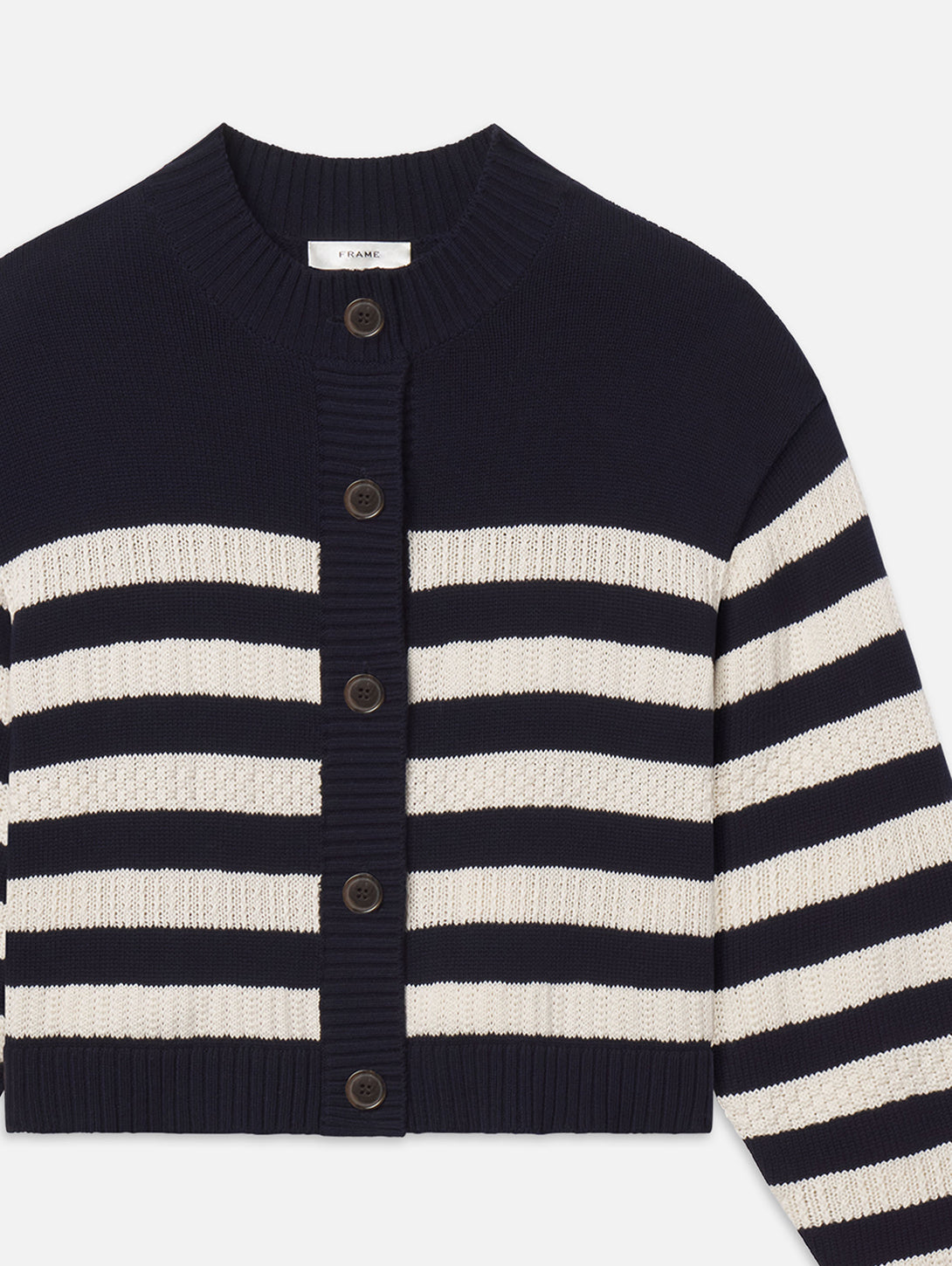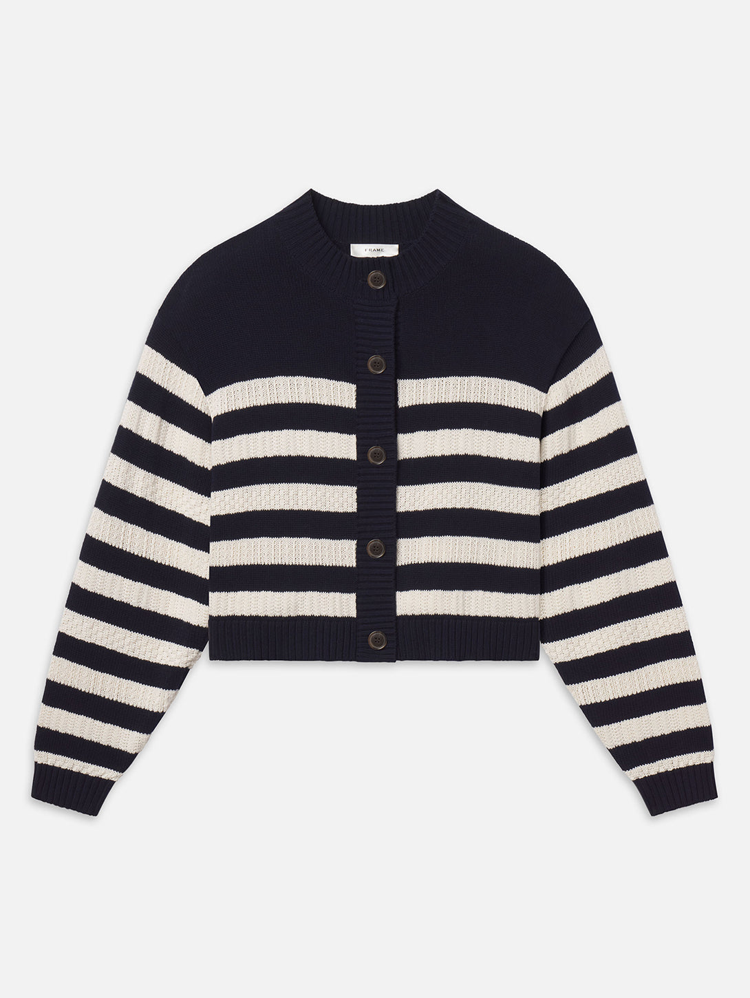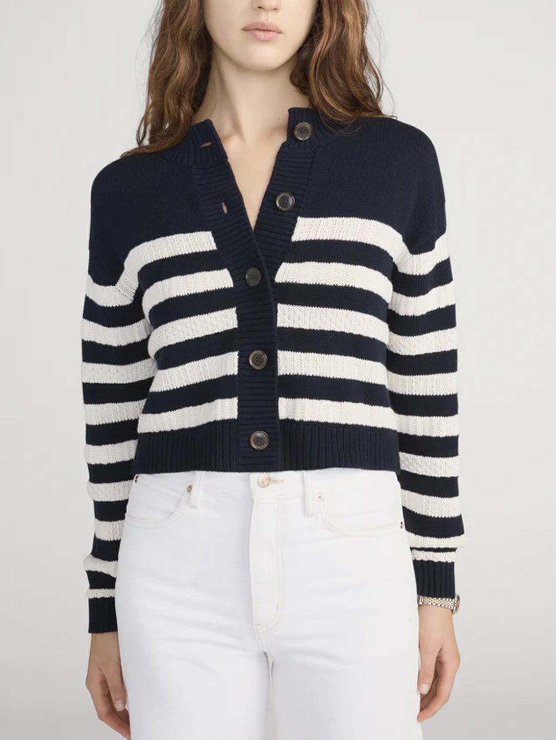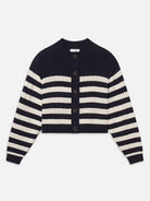 A cropped cardigan with bold contrast. The Variation Femme Cardi features horizontal striping, a button-front closure, and a classic crew neckline. Finished with a close fit for a sharp, modern look.