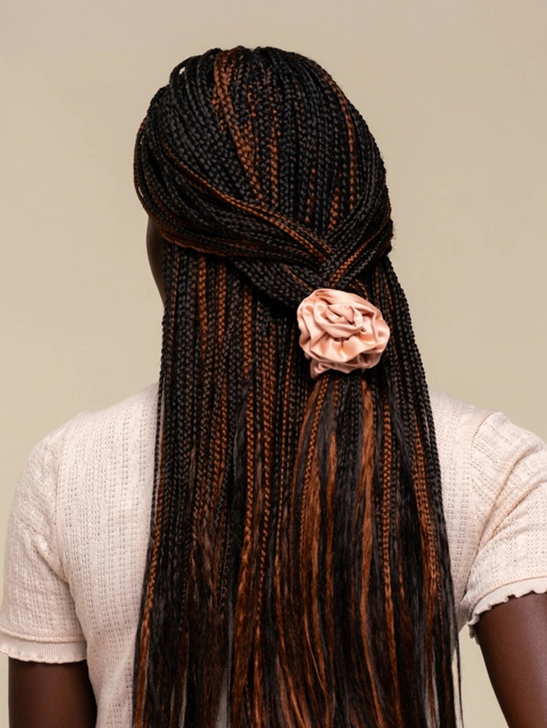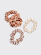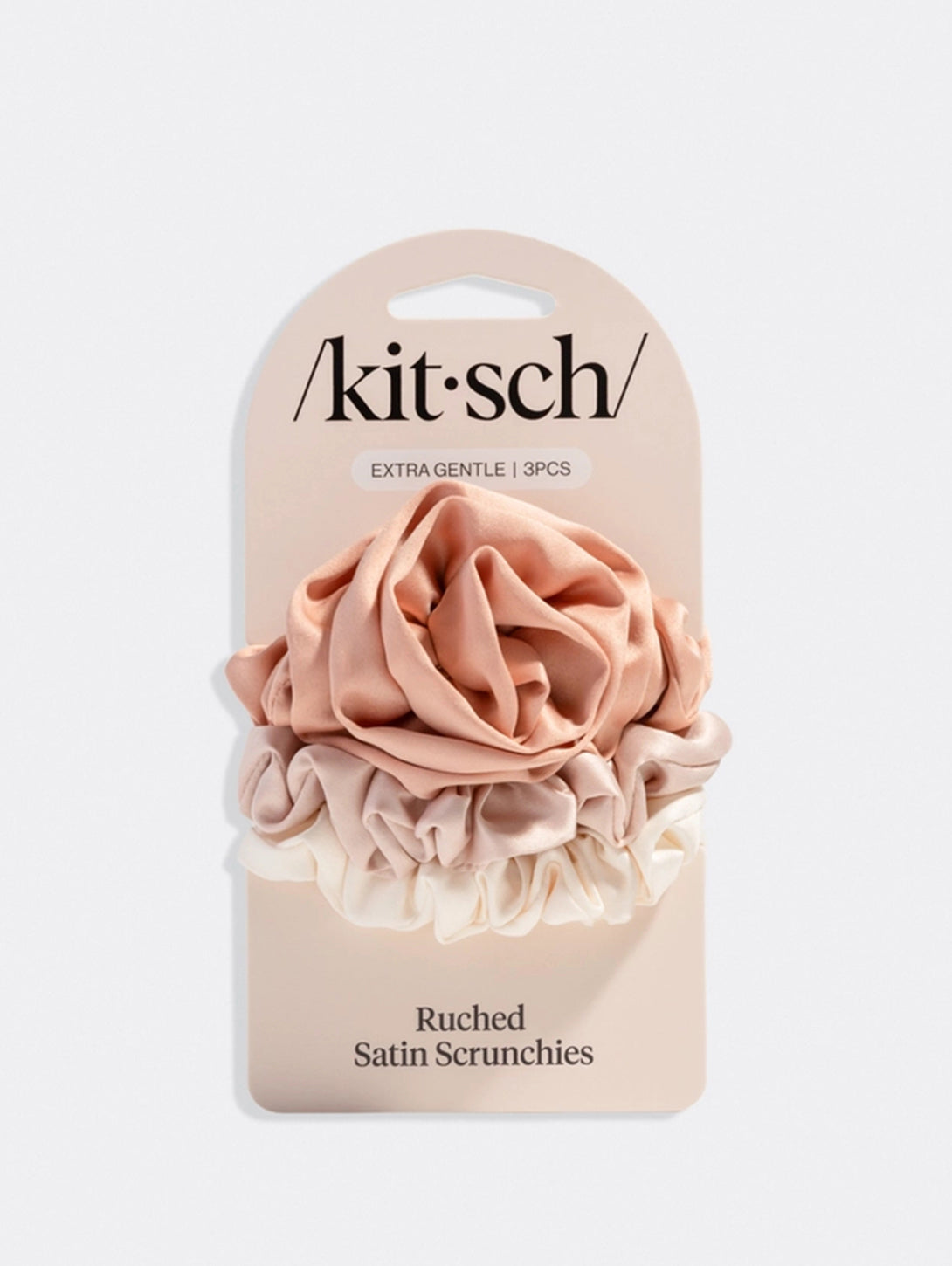 Introducing the Rosette Ruched Satin Scrunchies 3pc Set - Terracotta by KITSCH. These scrunchies are more than just a hair accessory. Designed with ruched satin fabric in a rich terracotta hue, they are perfect for any outfit. The set includes three scrunchies, allowing you to mix and match. As part of KITSCH's commitment to sustainability, these scrunchies are made as sustainably as possible. Elevate your hair game today with these chic scrunchies.