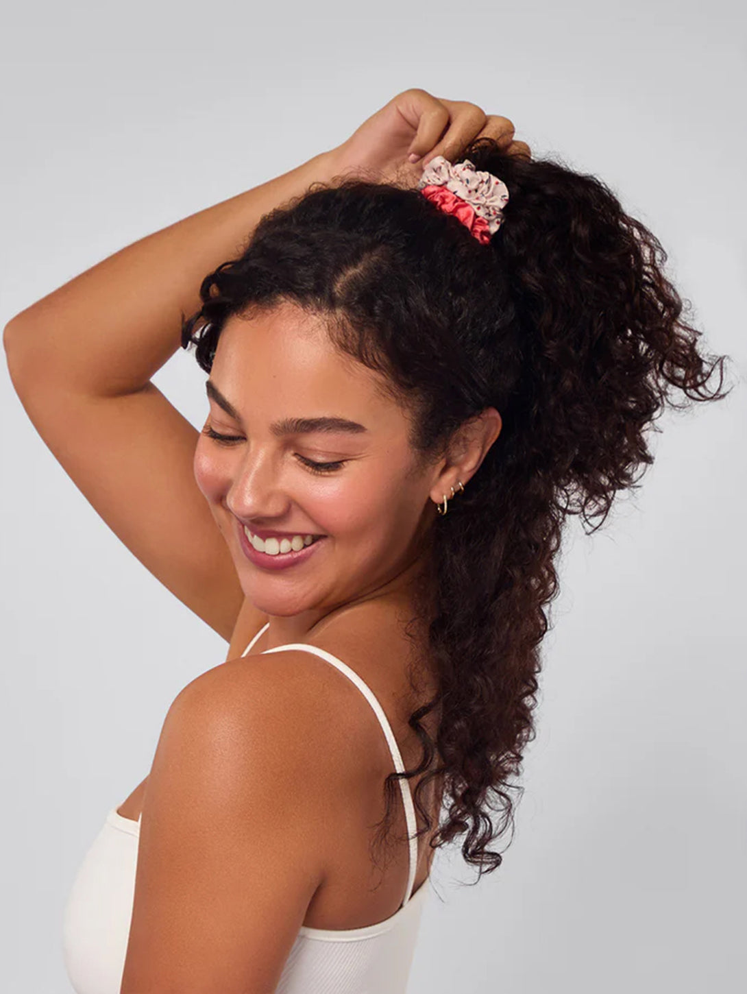 - Each package includes five satin scrunchies in assorted cherry-inspired and neutral tones.