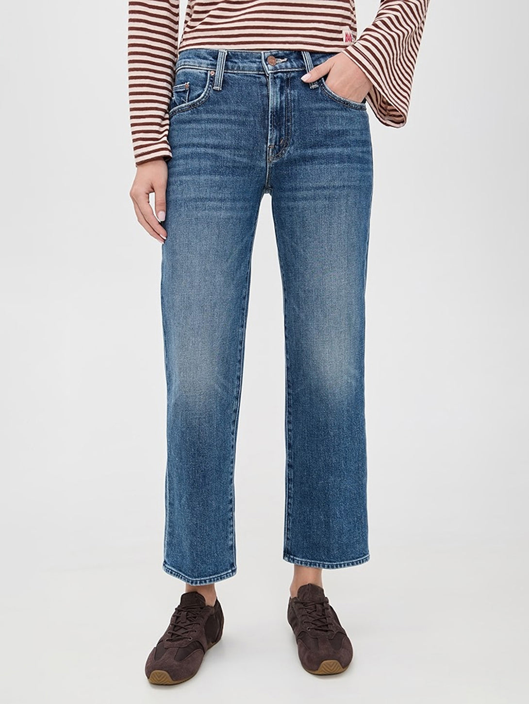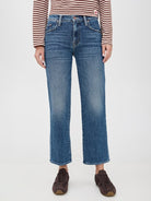 Mid-rise jeans with a wide straight leg, zip fly and clean ankle-length inseam. Cut from MOTHER SUPERIOR fabric, Tambourine Man is a mid-blue with whiskering and fading at the knee.
