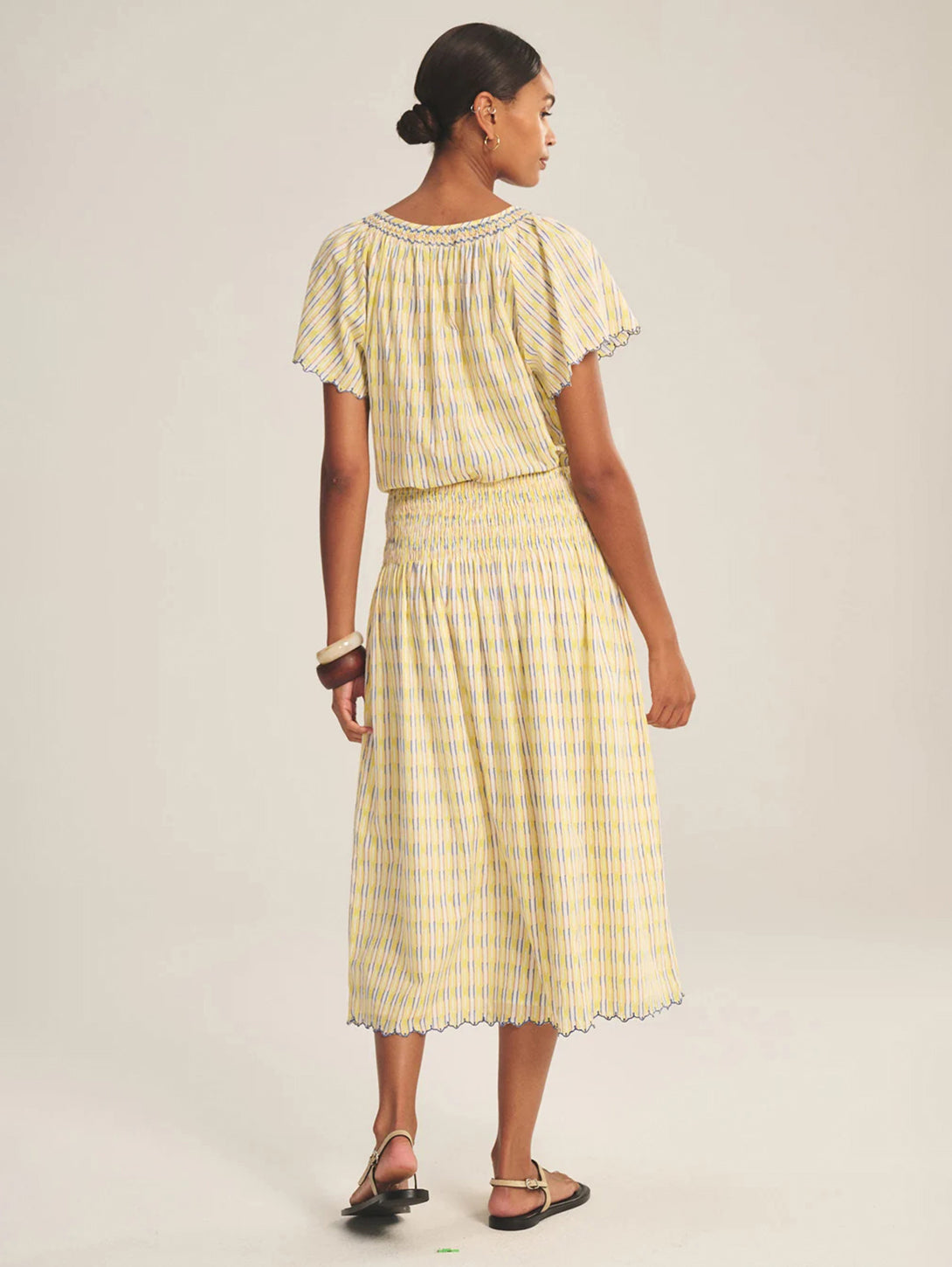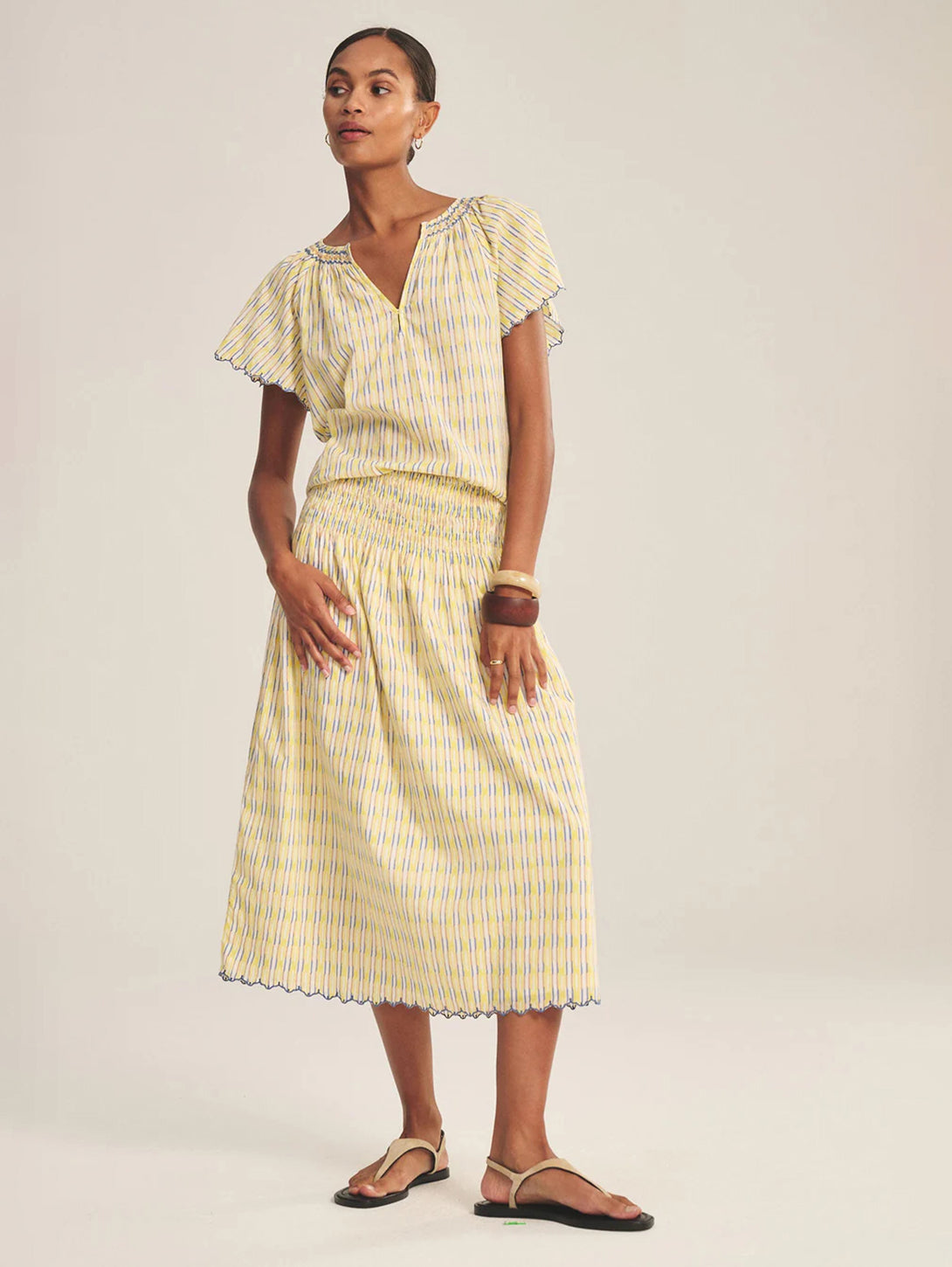 Printed midi skirt designed with a soft, flowing silhouette and subtle novelty stripe pattern. Crafted from lightweight cotton, it features a comfortable elasticized waistband and gentle gathers that create natural movement through the skirt. The buttercup tones and airy feel make it an effortless warm-weather staple, perfect for pairing with the matching Campbell top or a simple tee.