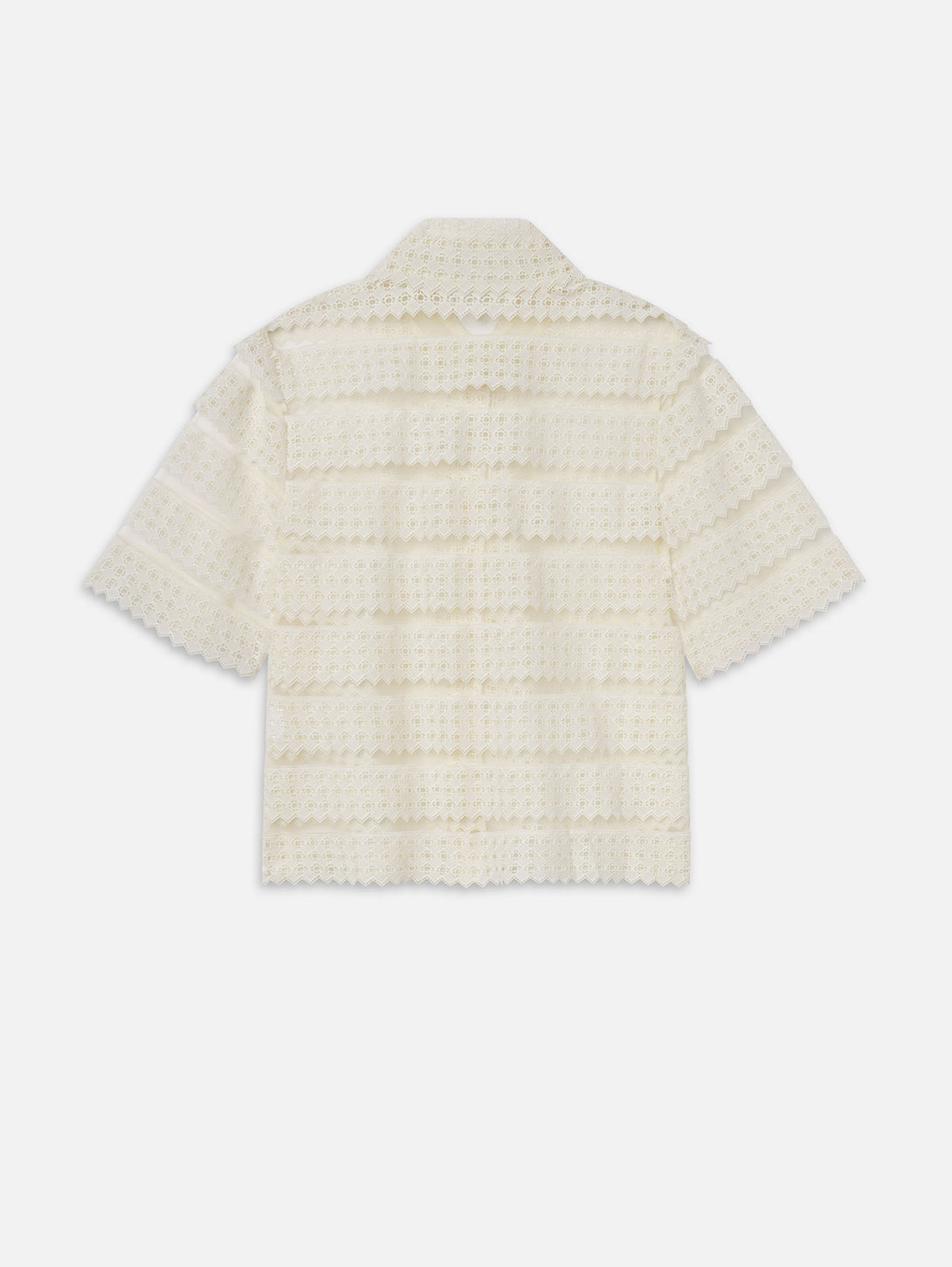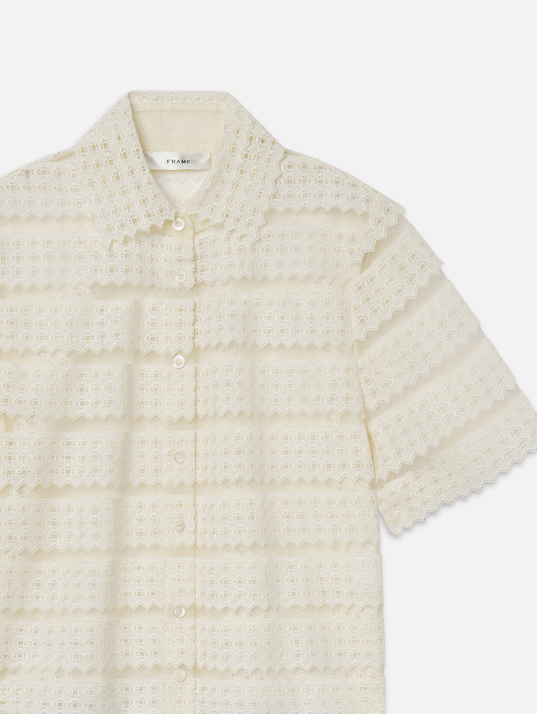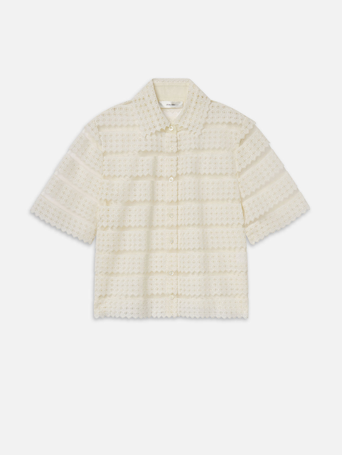 A short-sleeve blouse in sheer lattice crochet. Designed with a collar, button-front closure, and scalloped edges throughout. Lightweight with a straight fit.