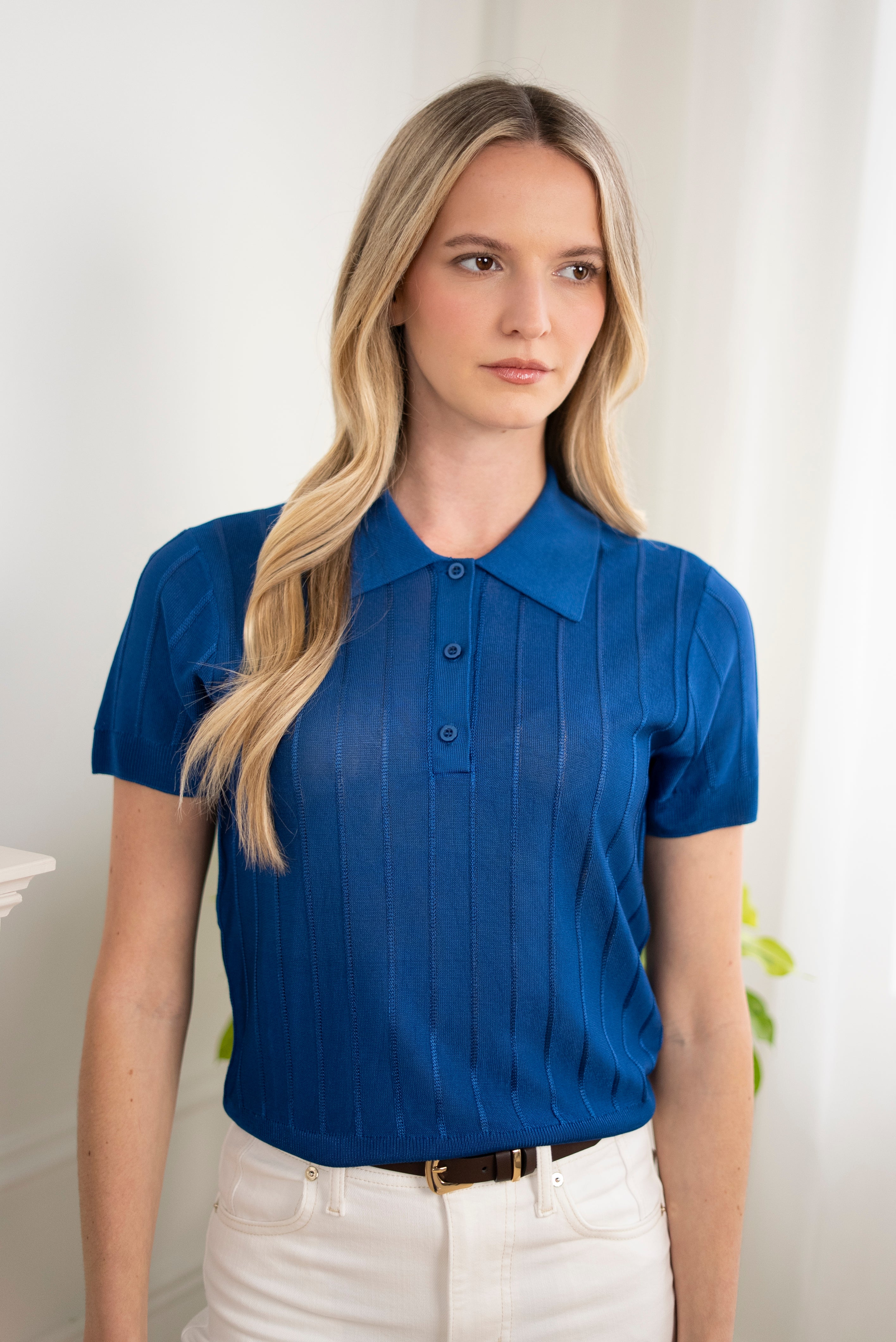 This viscose knit polo features fine vertical ribbing, a button placket, and a modern, waistband-skimming length. Pair it with high-waisted denim for a polished, put-together look. Cut close to the body and slightly sheer, it’s easy to layer—or wear solo when the mood calls for something barely there.