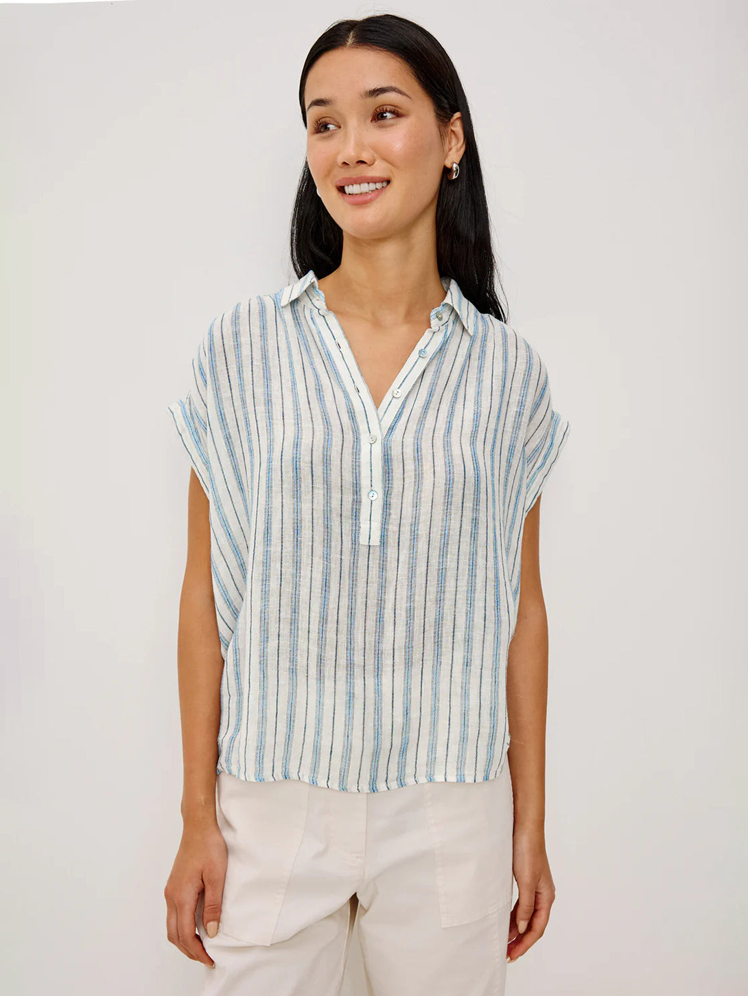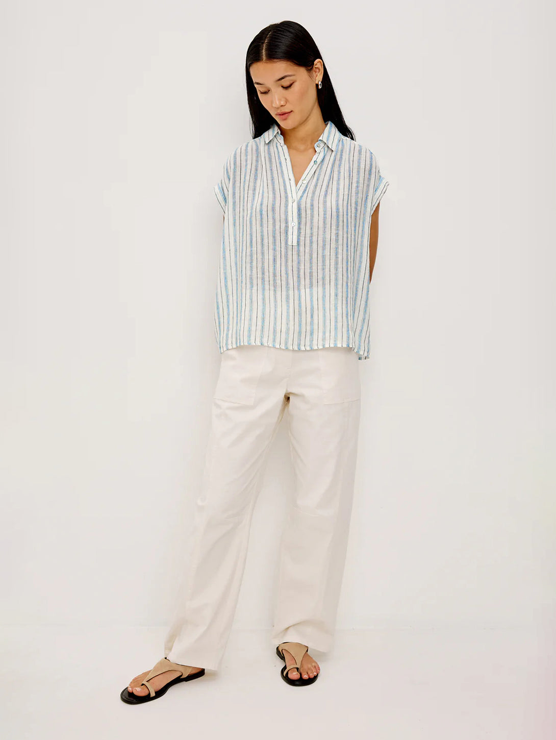 The Tuscany Shirt is crafted from lightweight, subtly textured linen and features a classic collar, half-front placket, and cuffed cap sleeves.