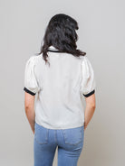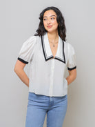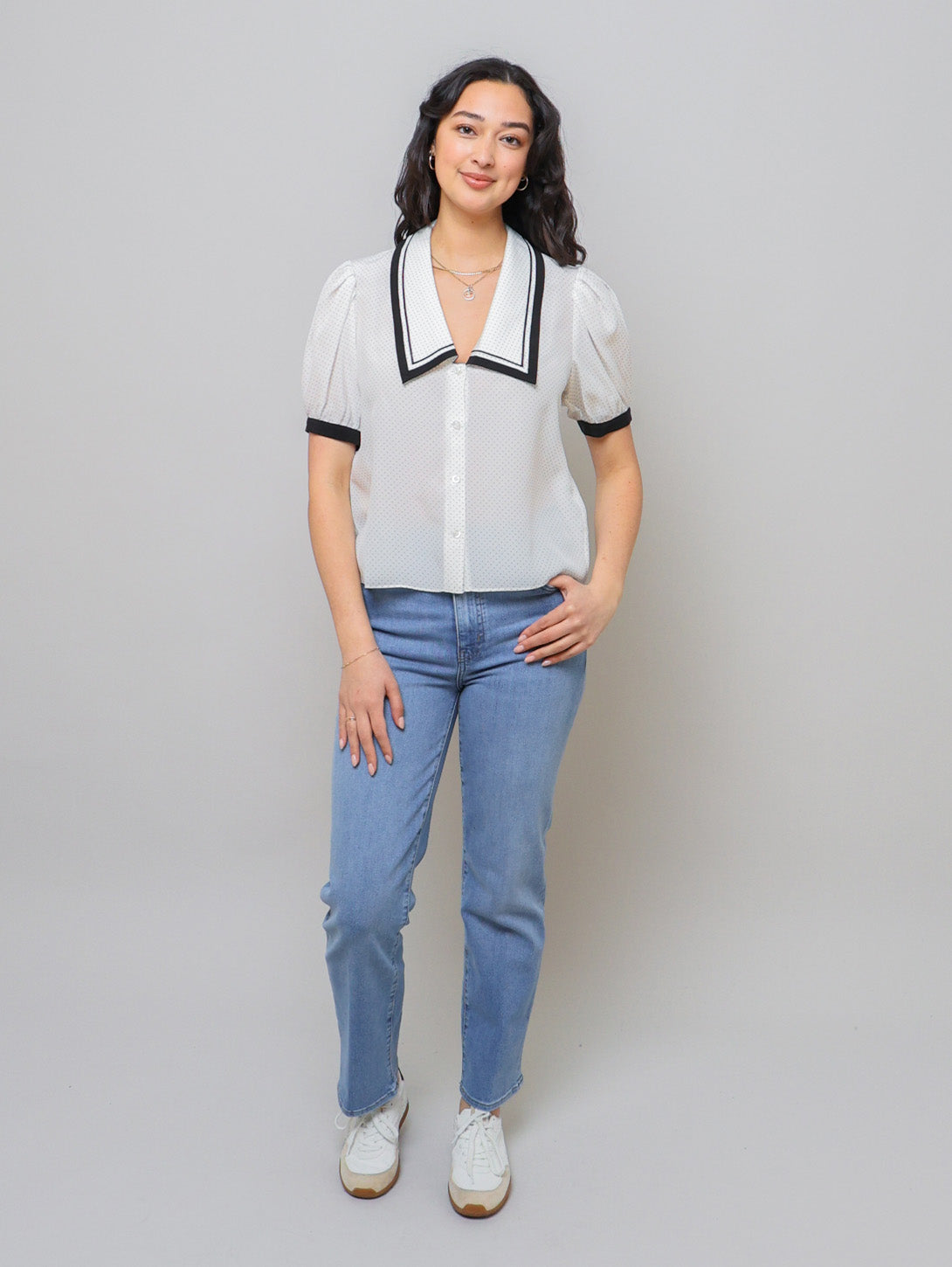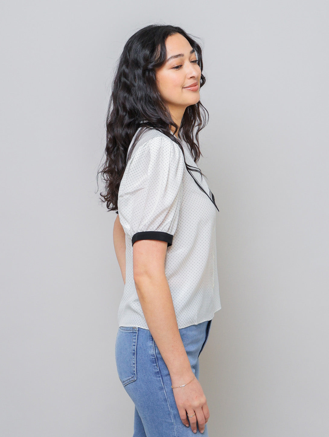 A short sleeve blouse crafted from 100% silk, done in white with tonal polka dots and an oversized collar that falls into an alluring V-neckline. Featuring feminine pleated sleeves for a romantic silhouette.